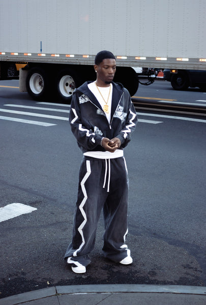The Signal Sweatsuit features washed black fleece with zig-zag paneling secured by metal studs. The hoodie includes front graphics as well as on the hoodie. This hoodie keeps a boxy, oversized silhouette. Model wearing Sz M