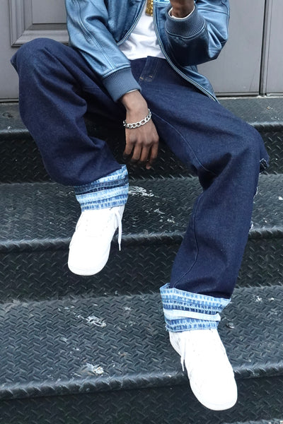 Dark wash denim with a relaxed fit and stacked fastened hems, featuring a subtle arrow detail at the hem. Sized for a precise, tailored fit. Designed for those who appreciate clean lines with a directional edge.